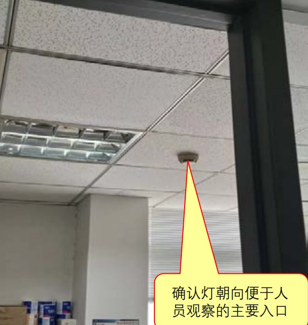 设备安装前应加强对施工人员的施工工艺交底,安装探测器底座一定要考虑探测器安装完毕后,其报警确认灯应朝向便于人员观察的入口方向。多入口场所应面向主要入口。